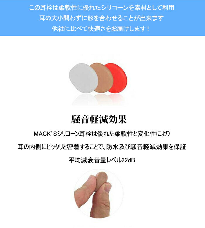 商品情報 商品名 MACK’s 柔軟性抜群 ソフトシリコーン 水泳 プール 防音 耳栓 機能 水泳、お風呂での防水、日常生活での防音 遮音 パッケージ内容 6ペア+収納箱 材質 シリコーン 製造国 アメリカ 交換時期 耳栓表面の粘着力が無くなり次第交換。